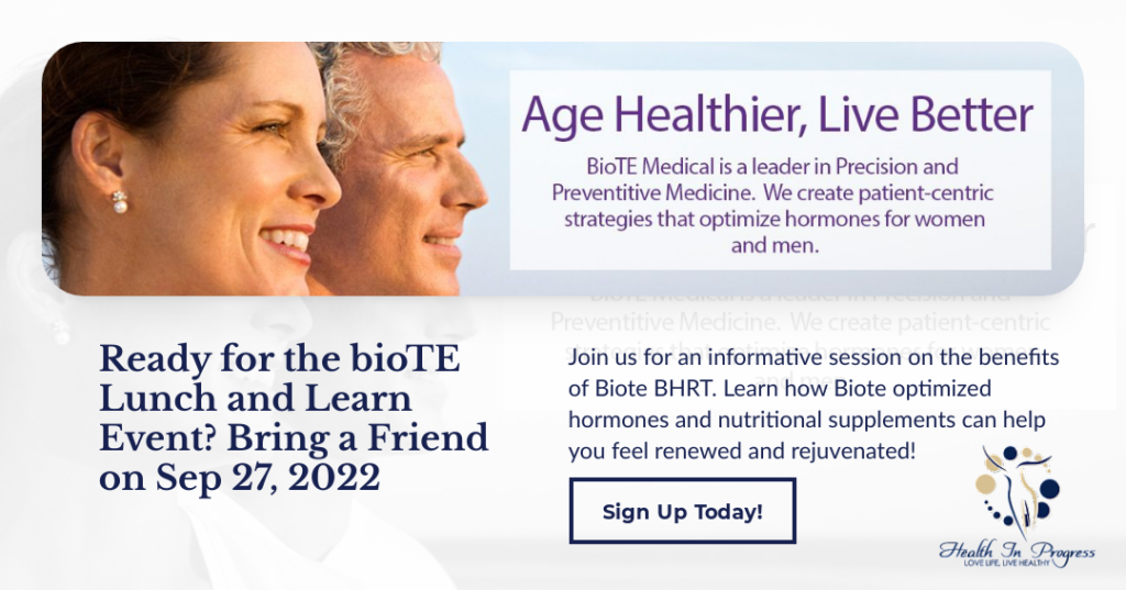 It’s time for a bioTE Lunch and Learn. Learn how BHRT with bioTE can be life-changing for women and men. Rewind the clock! – More energy – Increased Libido – Better muscle tone – Weight Loss – Improved Mood – Better Sleep – No more “brain fog”.